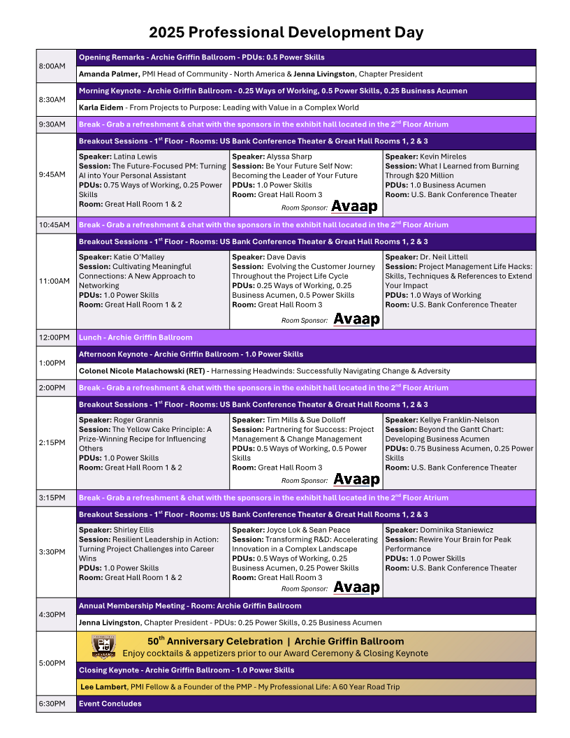 For chapter members who provided a valid PMI ID during registration and scanned into attended sessions, PDU's have been automatically reported. If a PMI ID wasn't provided or if an incorrect number was provided, please self-report the sessions attended by visiting PMI's PDU Claim page. A copy of the agenda can be downloaded here.